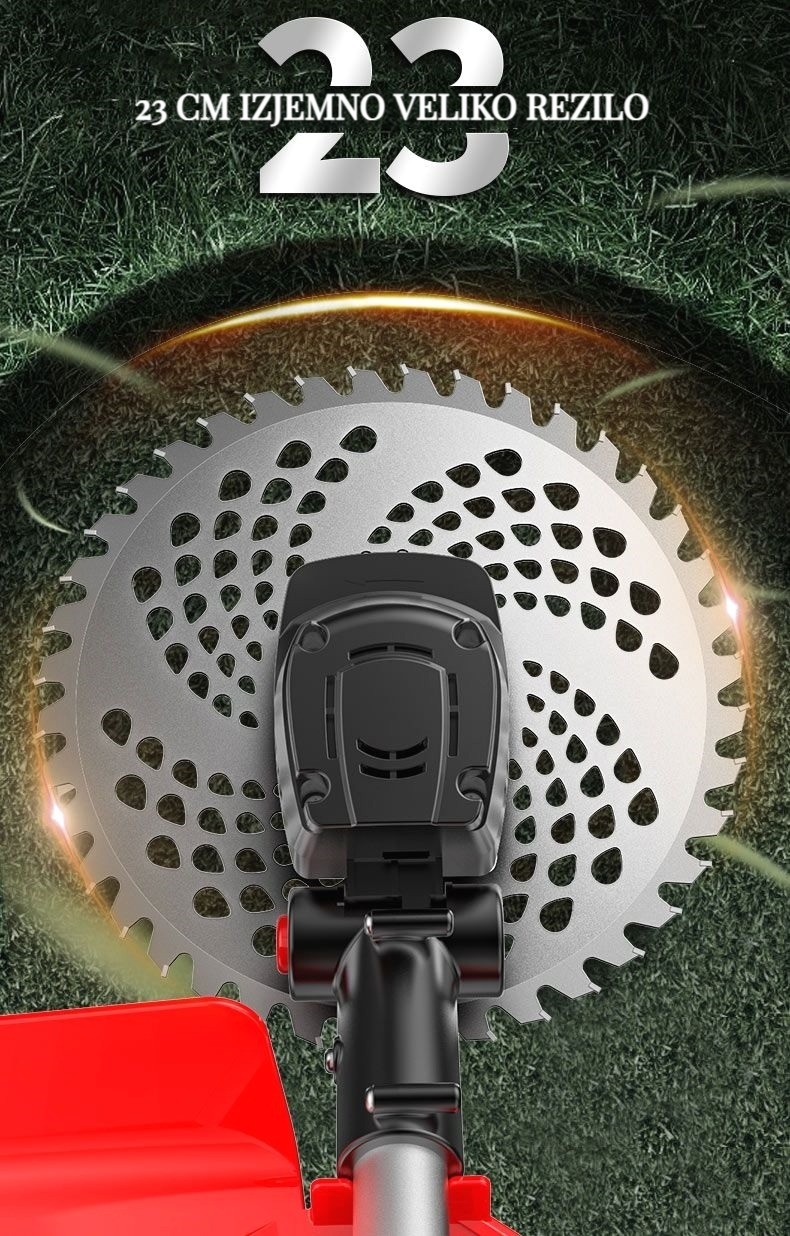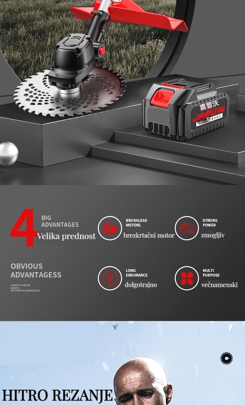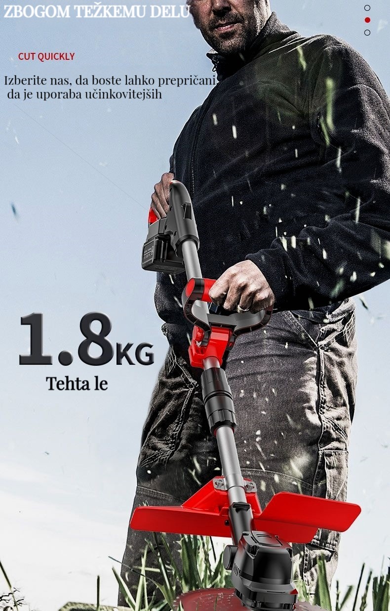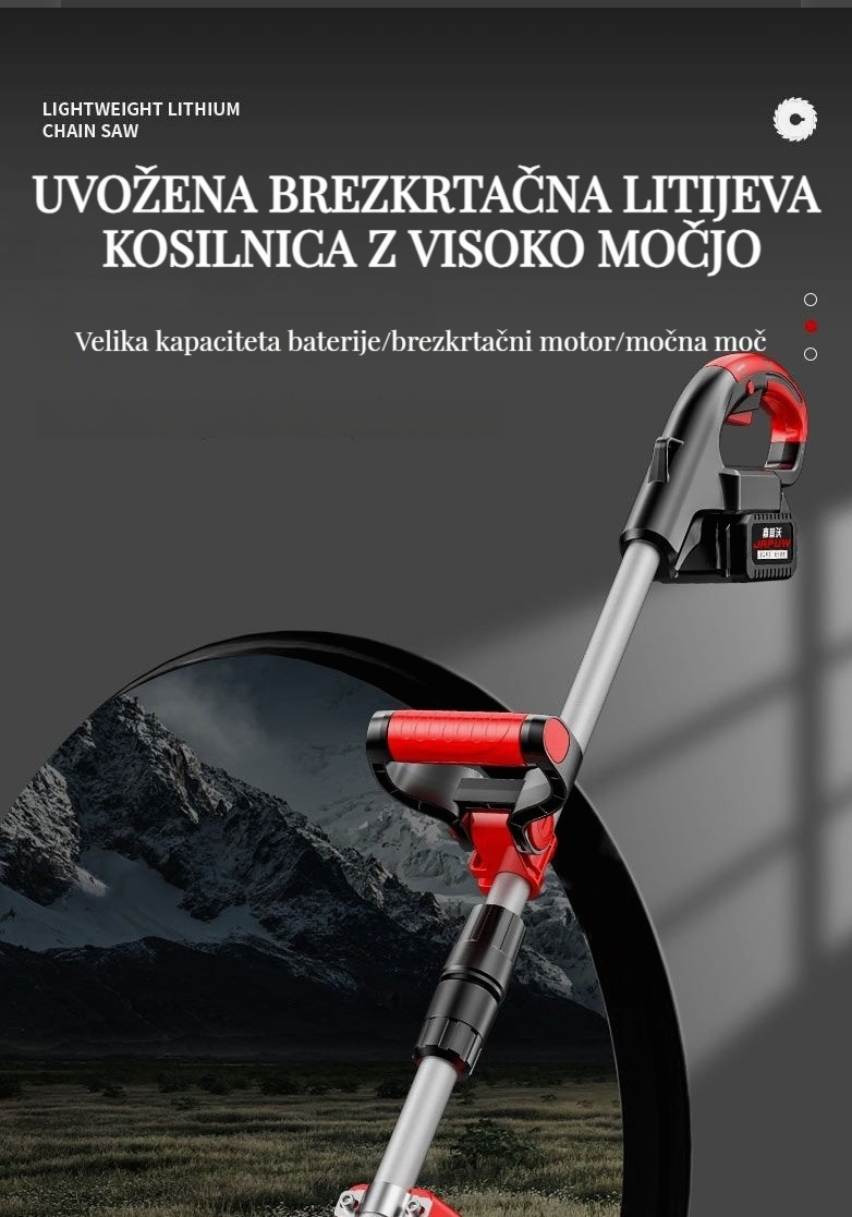 Brezkrtačna litij-ionska kosilnica, popravljanje trate in obrezovanje dreves je enostavno!