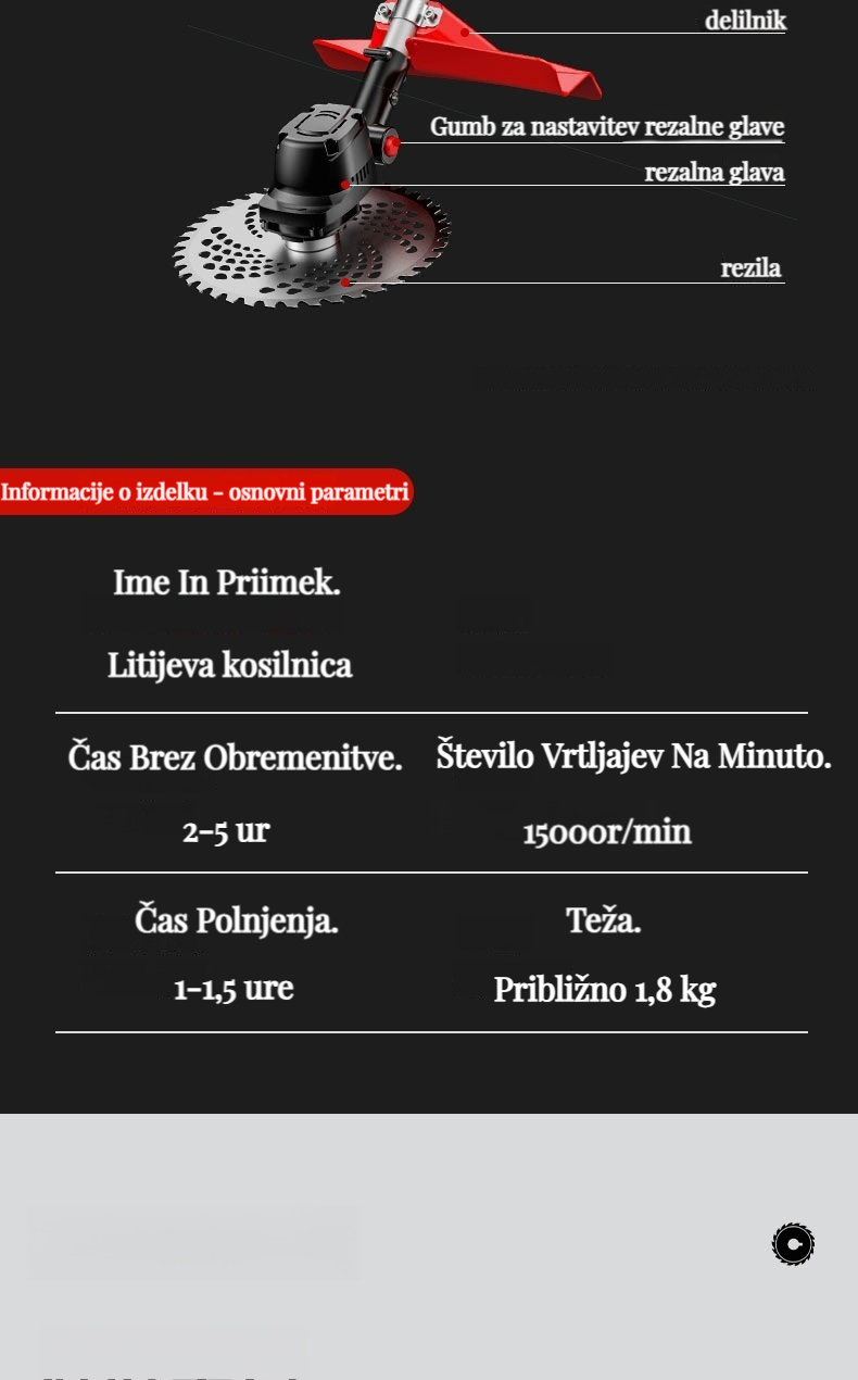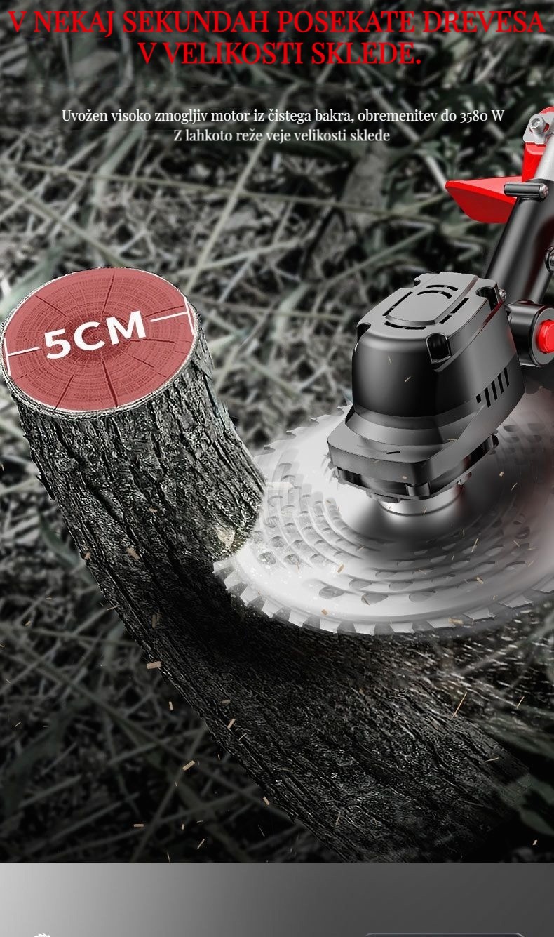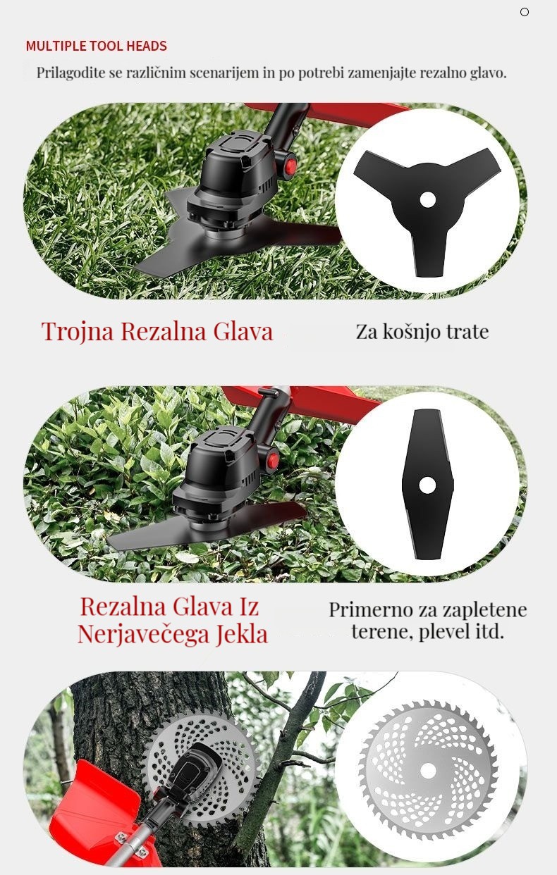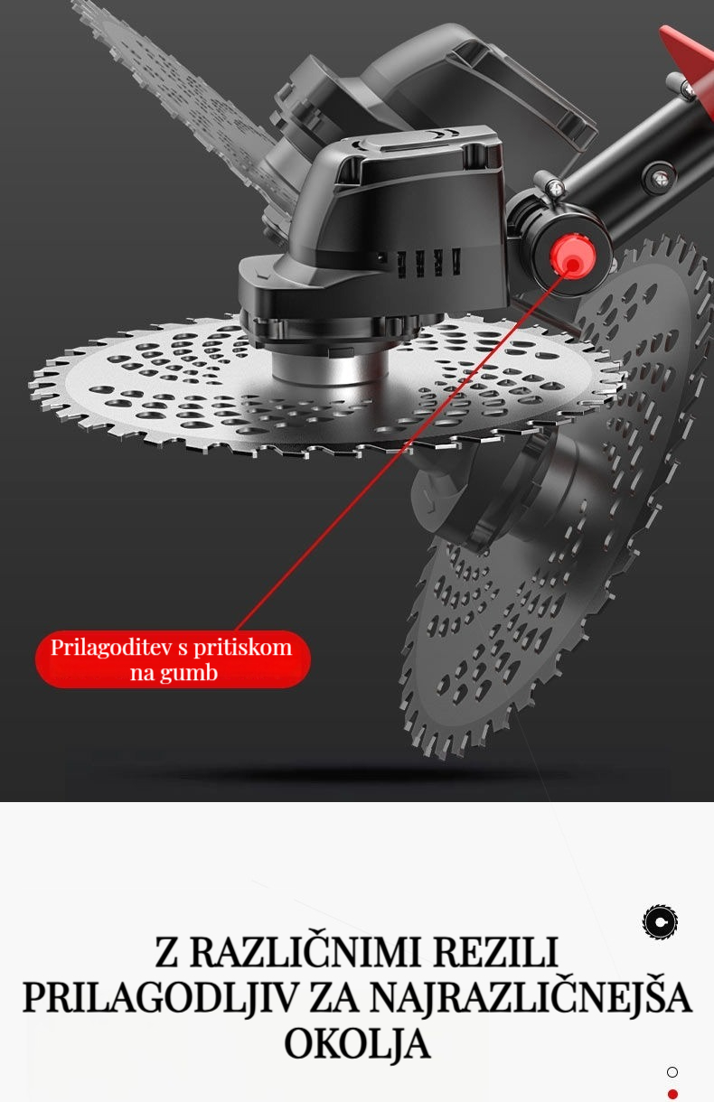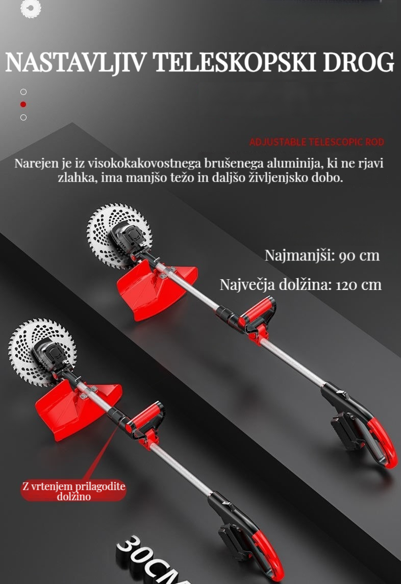 Brezkrtačna litij-ionska kosilnica, popravljanje trate in obrezovanje dreves je enostavno!